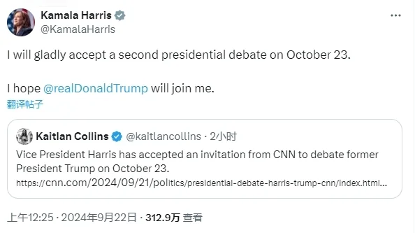 随后,哈里斯在社交媒体平台上发文称:“我很高兴接受10月23日的第二次总统辩论,我希望特朗普能加入进来。”