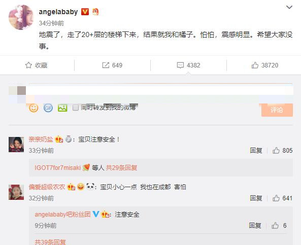 17日晚,四川宜宾连续发生6级和3.6级地震,正在成都的angelababy、王智先后发文报平安,“地震了,走了20+层的楼梯下来,结果就我和橘子。怕怕,震感明显,希望大家没事。”何炅、李小璐、陈赫、戚薇、袁弘、郁可唯等艺人发文祈祷平安。 来源:搜狐娱乐讯 搜狐娱乐讯 |