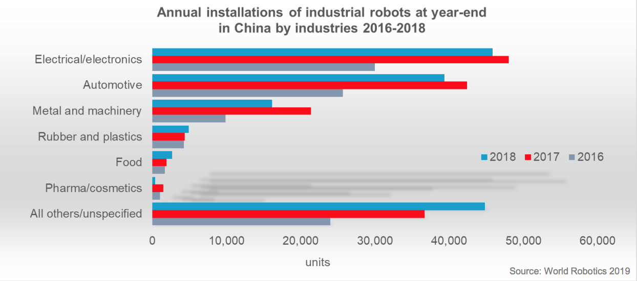 2016年-2018年,中国市场各行业的工业机器人年装机量。电气/电气行业、汽车行业、金属和机械工业始终是前三大应用行业,但在2018年这三个行业的工业机器人装机量均出现下滑。相反,其他行业则有所增长。