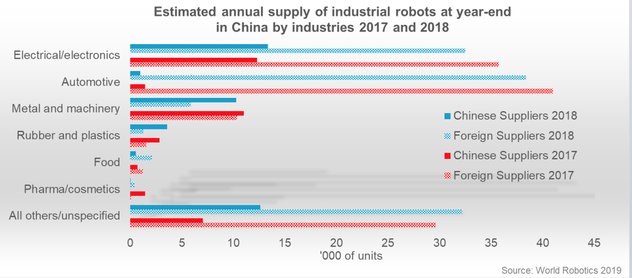 2018年,自主与外资品牌机器人分化明显。中国本土机器人在国内市场的总装机量增加了5%(2018年:27%,2017年:22%),这说明中国鼓励自主品牌机器人的政策导向带来了成效。另一方面,受汽车行业不景气影响,外资品牌的装机量(包括非中国供应商在中国生产的产品)下降了7%,约为113000台(2017年:约122000台)。