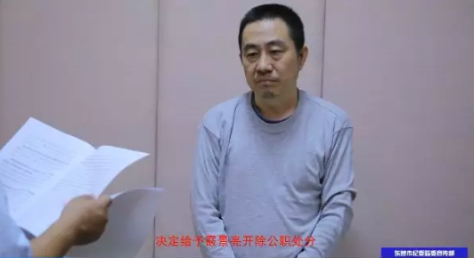 今年8月21日,东营市纪委监委对霰景亮宣布“双开”处分决定。图片来源于东营纪委监委宣传部视频截图