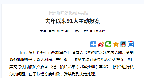 政知圈(微信ID:wepolitics)注意到,龙七贵是被主动投案的镇财政分局局长滕丽娟主动交代出来的。今年5月,龙七贵和滕丽娟曾在警示教育大会上公开检讨,这个检讨视频,还被当地纪委曝光了。