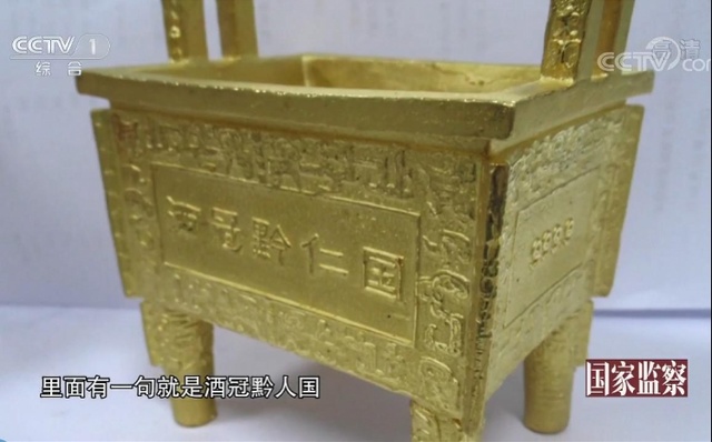 据贵州省纪委监委专案组工作人员介绍,有个经销商为了讨好袁仁国,送给袁仁国一个定制的5公斤的金鼎,然后上面还刻了一句诗,这句诗是清朝的贵州的一个诗人写的,里面有一句就是“酒冠黔人国”,当然这里面的“人”是人民的人,但是给他做金鼎的,把这个“人”就换成了袁仁国的后面两个字,“酒冠黔仁国”,袁仁国的“仁国”两个字,来讨好他。
