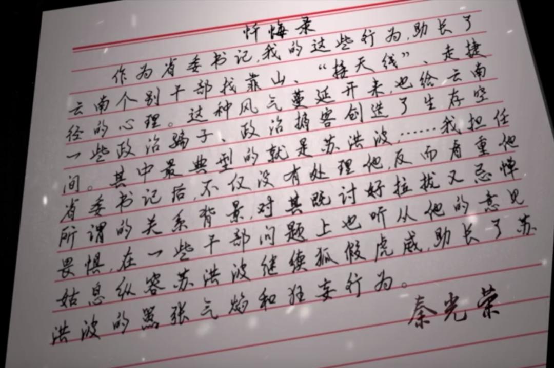 秦光荣在其忏悔录中,承认了自己违背党的组织路线,拿组织原则做交易,导致选人用人不良风气盛行的恶果,承认了自己想通过苏洪波攀高枝、谋取更高职位的愿望。