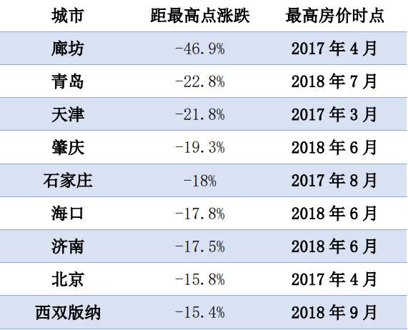 最高房价时点及跌幅分布表