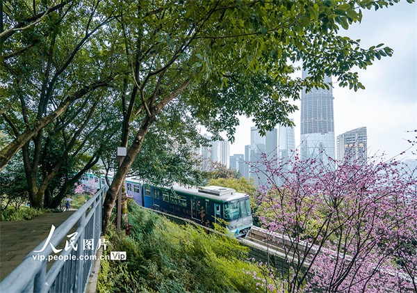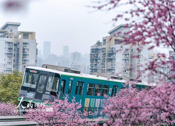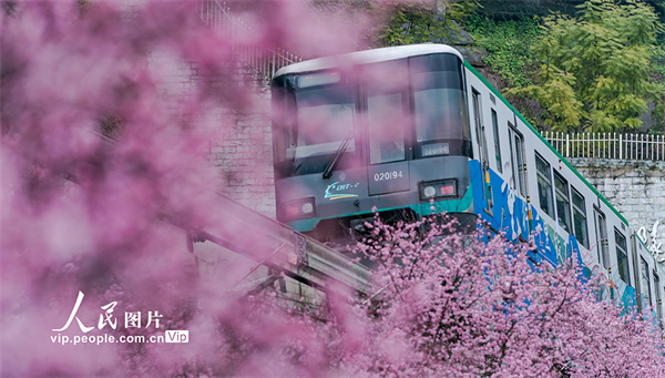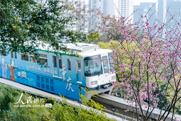 2022年2月20日,重庆市轨道交通二号线佛图关段的美人梅迎春绽放,列车穿行花海,犹如开往春天的列车。 |